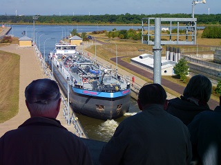 Das alte Schiffshebewerk Magdeburg-Rothensee entstammt Planungen aus den 1920er Jahren. Bis zu einer Länge von 83m können Schiffe dieses Abstiegsbauwerk passieren. Da etwa 20% der Schiffe, die heute die Elbe und die Kanälen befahren, länger sind, wurde nebenan von 1997-2001 die Schleuse Rothensee errichtet. Sie ist als Sparschleuse konzipiert, damit der durch die Schleusungen entstehende Wasserverlust geringer gehalten wird. Die Schleusenkammer ist ca. 12,50m breit und 190m lang. Sie hat eine vom Elbwasserstand abhängige Fallhöhe von 10,45m bis 18,46m. Das Obertor ist ein 5,10m hohes Drehsegmenttor. Das Unterhaupt verschließt wegen der stark wechselnden Elbwasserstände ein fast 22m hohes Stemmtor.